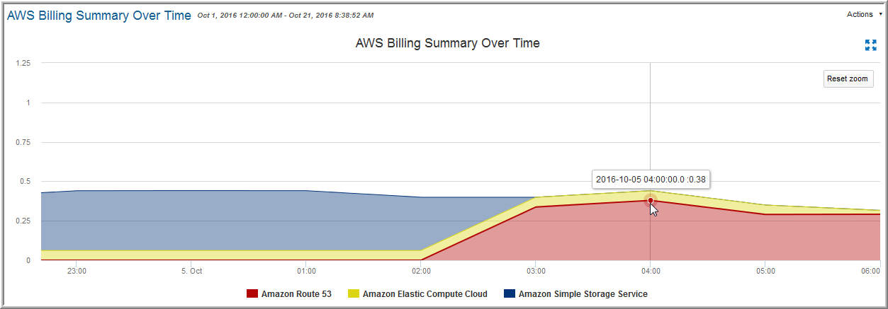 This chart breaks out the various cloud services. Click an area of the chart to access the AWS Account Billing Details. Hover your mouse over data points on the line to view costs for a specific date and time.