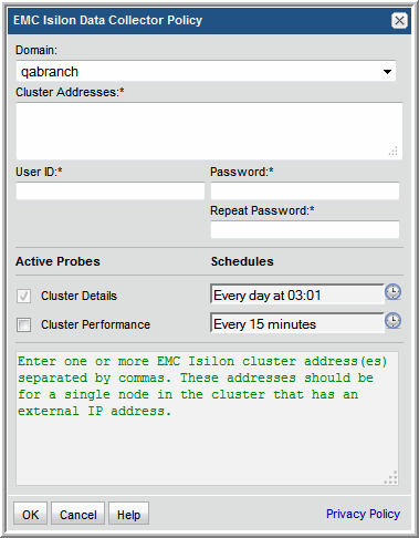 Cluster Performance Schedule | Check the checkbox to activate cluster performance collection to populate performance metrics for EMC Isilon clusters. Click the clock icon to create a schedule. Every Minute, Hourly, Daily, Weekly, and Monthly schedules may be created. Relative schedules are relative to when the Data Collector is restarted. Advanced use of native CRON strings is also available. Examples of CRON expressions: */30 * * * * means every 30 minutes */20 9-18 * * * means every 20 minutes between the hours of 9am and 6pm */10 * * * 1-5 means every 10 minutes Mon - Fri. | Every 15 minutes |
