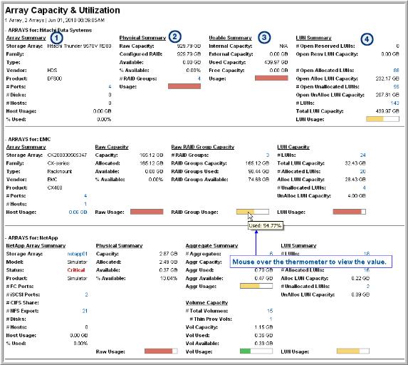 Usage/RAID Group Usage | Thermometer with mouse-over that displays the percentage used. |